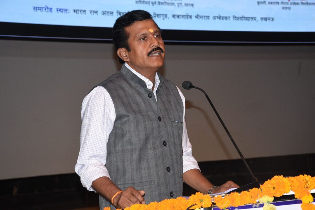 विशिष्ट अतिथि एवं सावित्रीबाई फुले विश्वविद्यालय, पुणे के हिंदी विभाग के विभागाध्यक्ष प्रो. सदानंद के. भोंसले ने अपने उद्बोधन में कहा कि संतों की पावन भूमि से ही परिवर्तन की सशक्त लहरें उत्पन्न होती हैं, जो समाज को नई दिशा प्रदान करती हैं। उन्होंने तृतीय रत्न पुस्तक का उल्लेख करते हुए बताया कि किस प्रकार यह कृति समाज में व्याप्त अज्ञानता और कुरीतियों को उजागर कर जागरूकता फैलाने का कार्य करती है। उन्होंने विशेष रूप से यह भी कहा कि एक माँ अपने बच्चों को जो संस्कार देती है, वह कार्य कई बार दस शिक्षक भी मिलकर नहीं कर पाते, जिससे परिवार और समाज के निर्माण में महिलाओं की भूमिका अत्यंत महत्वपूर्ण सिद्ध होती है। इस संदर्भ में प्रो. भोंसले ने महात्मा ज्योतिबा फुले के योगदान को रेखांकित करते हुए बताया कि उन्होंने शिक्षा को समाज परिवर्तन का माध्यम बनाकर वंचित वर्गों और महिलाओं के उत्थान के लिए अभूतपूर्व कार्य किए।