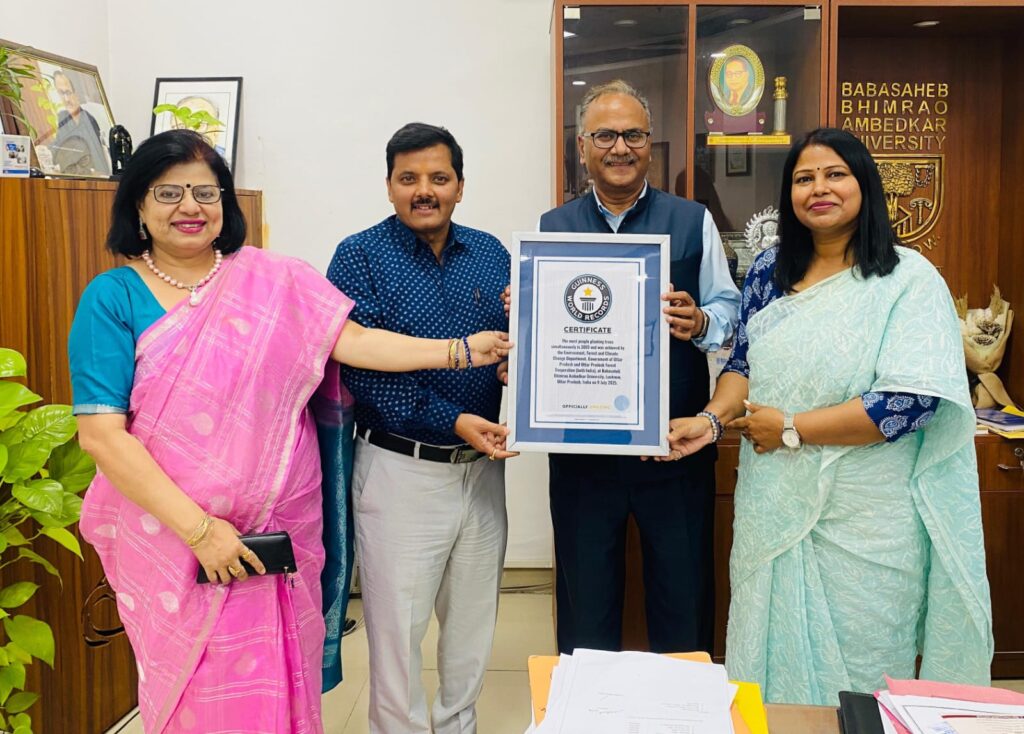 अशोक यादव, लखनऊ : बाबासाहेब भीमराव अम्बेडकर विश्वविद्यालय (BBAU) ने पर्यावरण संरक्षण के क्षेत्र में उत्तर प्रदेश सरकार के वन विभाग के साथ संयुक्त रूप से एक उल्लेखनीय उपलब्धि हासिल करते हुए ‘गिनीज वर्ल्ड रिकॉर्ड’ का प्रमाणपत्र प्राप्त किया है। यह सम्मान विश्वविद्यालय को एक ही समय पर एक ही स्थान पर सर्वाधिक पौधे लगाने के सफल प्रयास के लिए प्रदान किया गया है। इस उपलब्धि ने न केवल विश्वविद्यालय का गौरव बढ़ाया है, बल्कि पर्यावरण के प्रति उसकी प्रतिबद्धता को भी राष्ट्रीय एवं अंतरराष्ट्रीय स्तर पर स्थापित किया है।