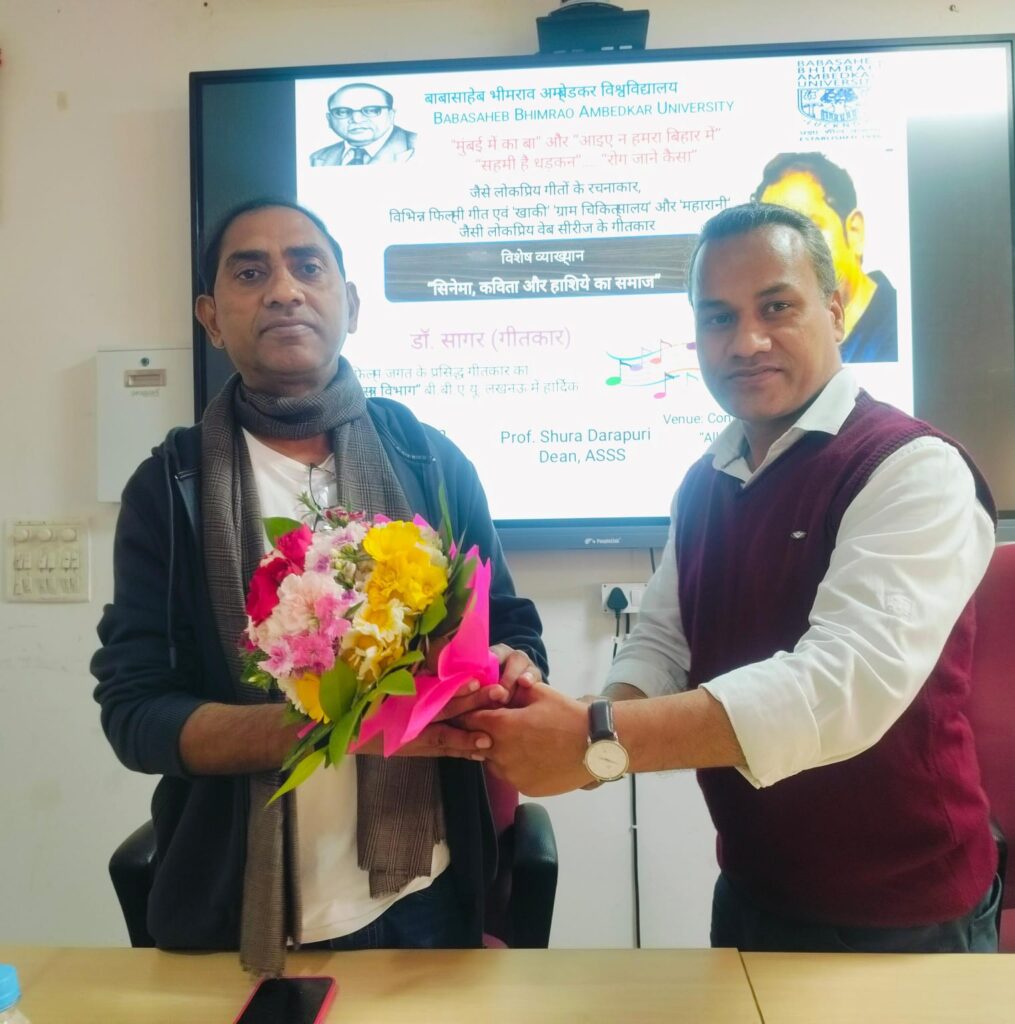 सूर्योदय भारत समाचार सेवा, लखनऊ : बाबासाहेब भीमराव अम्बेडकर विश्वविद्यालय में मंगलवार 24 फरवरी को अर्थशास्त्र विभाग की ओर से ‘सिनेमा, कविता और हाशिये का समाज’ विषय पर विशेष व्याख्यान का आयोजन किया गया। कार्यक्रम में मुख्य अतिथि के तौर पर मुंबई फिल्म जगत के प्रसिद्ध गीतकार डॉ. सागर उपस्थित रहे। इसके अतिरिक्त मंच पर आईएएस अधिकारी योगेश कुमार, गायक हंसराज, अर्थशास्त्र विभाग के विभागाध्यक्ष प्रो. सनातन नायक एवं कार्यक्रम संयोजक डॉ. प्रणब कुमार आनंद मौजूद रहे।