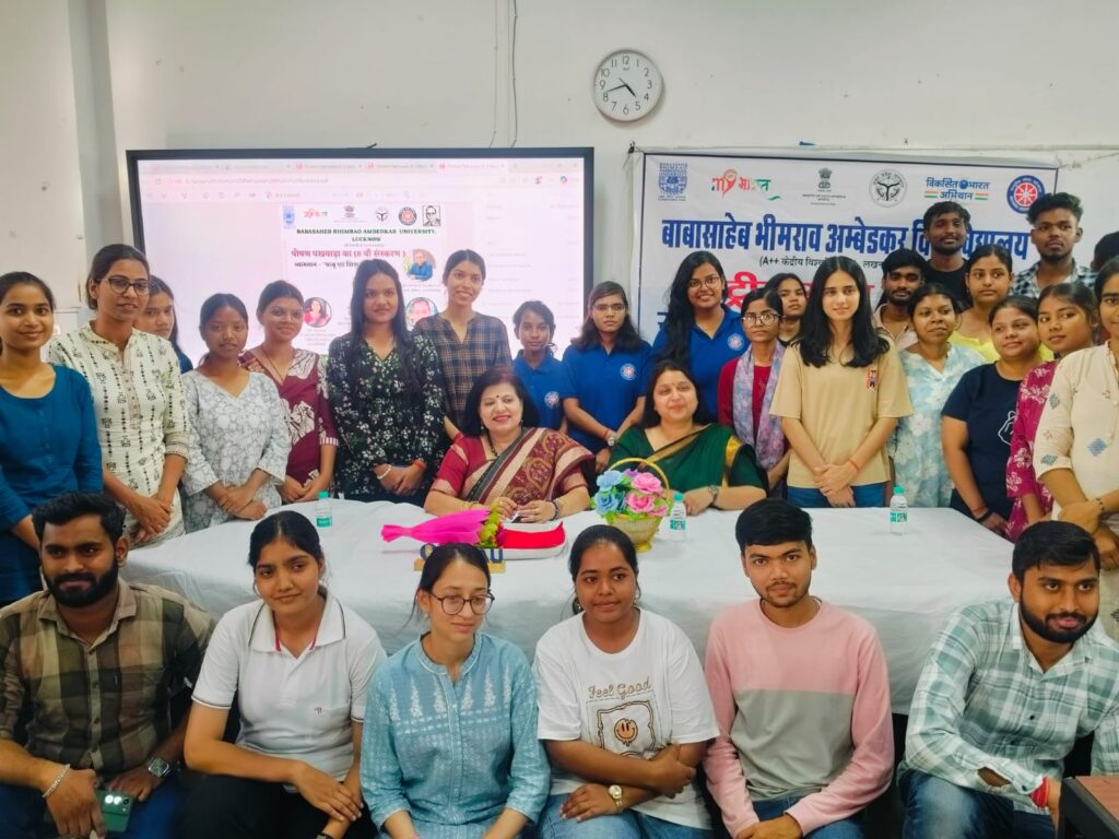सूर्योदय भारत समाचार सेवा, लखनऊ : बाबासाहेब भीमराव अम्बेडकर विश्वविद्यालय में बुधवार 22 अप्रैल को राष्ट्रीय सेवा योजना इकाई की ओर से पोषण पखवाड़ा (8वां संस्करण) के अंतर्गत कार्यक्रम का आयोजन किया गया। कार्यक्रम में मुख्य वक्ता के तौर पर आहार एवं पोषण विभाग की प्रो. सुनीता मिश्रा उपस्थित रही। इसके अतिरिक्त राष्ट्रीय सेवा योजना इकाई की कार्यक्रम अधिकारी डॉ. तरूणा मौजूद रही। सर्वप्रथम डॉ. तरूणा ने कार्यक्रम में उपस्थित सभी लोगों का स्वागत किया एवं सभी को कार्यक्रम के उद्देश्य एवं रुपरेखा से अवगत कराया।