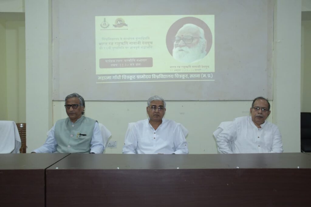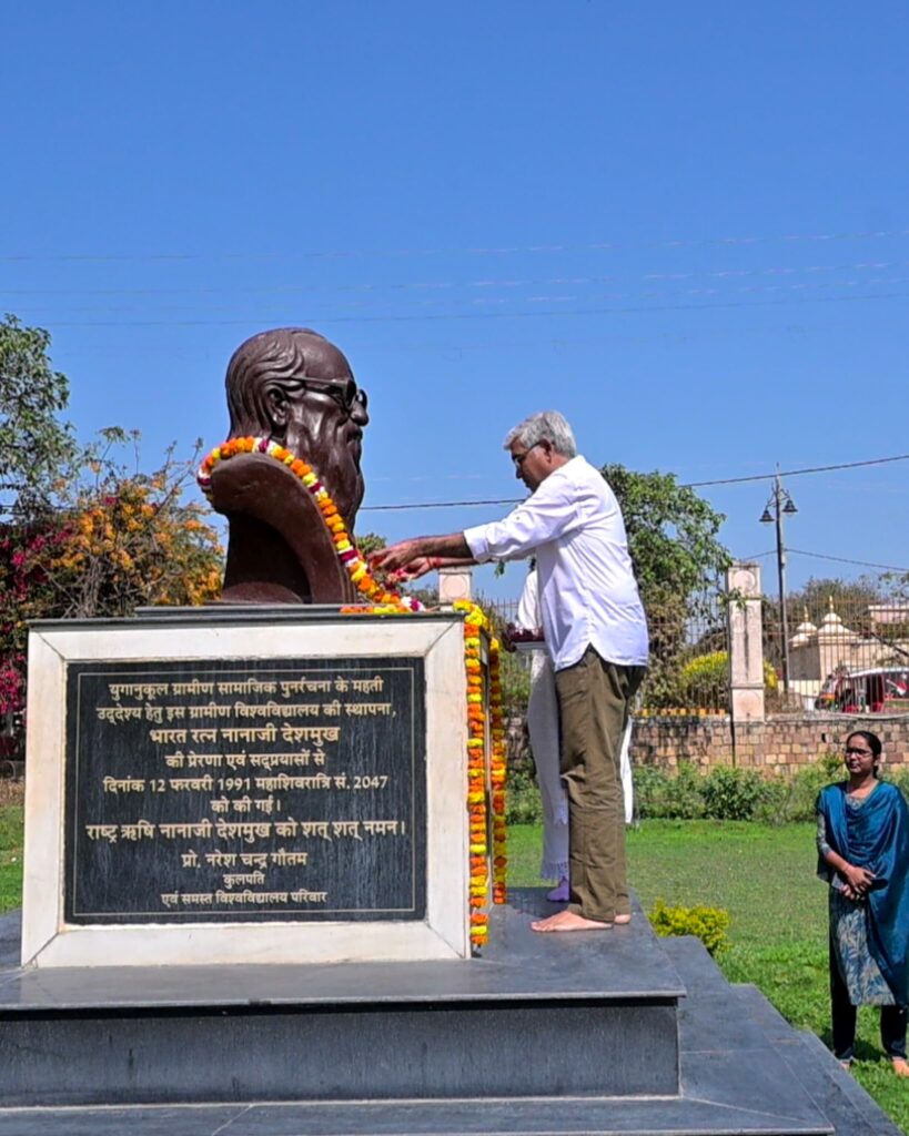 प्रो. चौबे ने कहा कि विश्वविद्यालय की स्थापना नाना जी देशमुख की परिकल्पना पर मध्यप्रदेश शासन द्वारा की गई थी और उन्हें संस्थापक कुलाधिपति नियुक्त किया गया था। ग्रामीण पुनर्निर्माण, सामाजिक समरसता और स्वावलंबन के उनके आदर्श आज भी विश्वविद्यालय की अकादमिक, शोध एवं प्रसार गतिविधियों का आधार हैं।