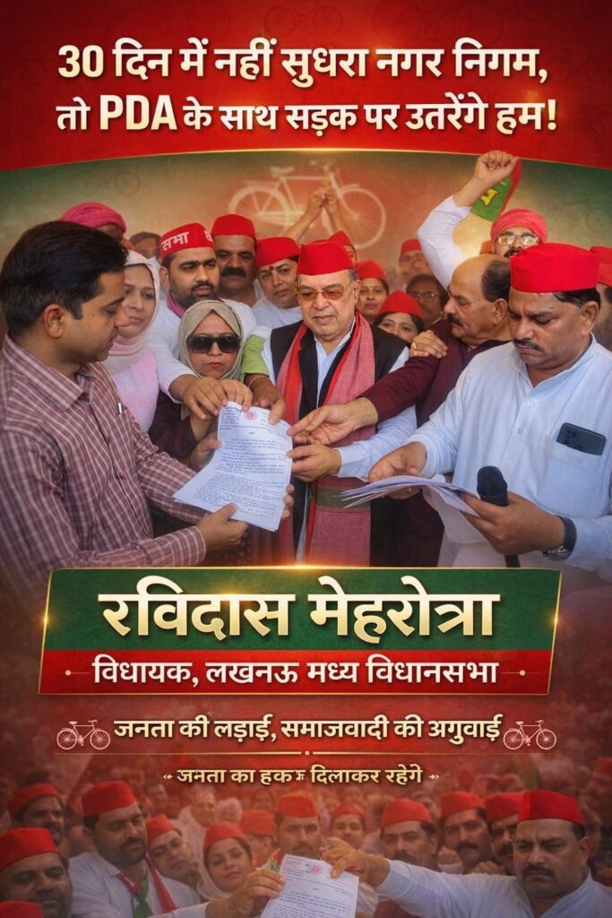 सूर्योदय भारत समाचार सेवा, लखनऊ : समाजवादी पार्टी, लखनऊ मध्य विधानसभा क्षेत्र के विधायक रविदास मेहरोत्रा के नेतृत्व में सोमवार नगर निगम के खिलाफ जोरदार प्रदर्शन करते हुए घेराव किया। यह आंदोलन क्षेत्र की जनता के मूलभूत अधिकारों और आवश्यक सुविधाओं की मांग को लेकर किया गया, जिसमें हजारों की संख्या में लोगों ने भाग लेकर अपनी आवाज बुलंद की।