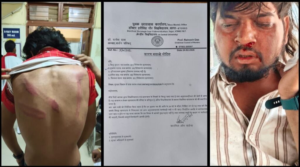 सूर्योदय भारत समाचार सेवा, सागर, मप्र : ‘पहले हमारे साथ कैंपस में मारपीट हुई. एक नहीं दो-दो बार और अब हमें ही यूनिवर्सिटी प्रशासन अनुशासनहीनता के लिए कारण बताओ नोटिस जारी कर रहा है. हम से पूछा जा है कि हमारे खिलाफ छात्रावास से निष्कासन और अन्य अनुशासनात्मक कार्रवाई क्यों न की जाए. हम पीड़ित हैं और हमारे ही खिलाफ कार्रवाई की बात की जा रही है.’ ये बातें मध्य प्रदेश के सागर स्थित डॉ. हरि सिंह गौर केंद्रीय विश्वविद्यालय के स्नातक छात्र बिट्टू कुमार ने मंगलवार (24 फरवरी) को मीडिया से फोन पर बातचीत में कहीं. उन्होंने बताया कि बीते पांच दिनों के भीतर कैंपस में उन पर और उनके अन्य साथियों पर दो बार हिंसक हमले हो चुके हैं, जिसकी शिकायत उन्होंने विश्वविद्यालय प्रशासन, स्थानीय थाने और जिलाधिकारी से भी की है, लेकिन फिलहाल उनकी सुरक्षा का उन्हें कहीं से कोई आश्वासन नहीं मिला है.