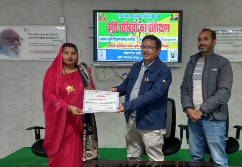 सूर्योदय भारत समाचार सेवा, चित्रकूट। दीनदयाल उपाध्याय शोध संस्थान तुलसी कृषि विज्ञान केन्द्र, गनीवा में आयोजित 5-दिवसीय कृषि सखियों के प्रशिक्षण कार्यक्रम का समापन शुक्रवार को हुआ। वरिष्ठ वैज्ञानिक एवं प्रमुख डॉ. राजेंद्र सिंह नेगी ने प्रमाणपत्र वितरित कर कार्यक्रम का समापन किया। इस प्रशिक्षण में कृषि सखियों को प्राकृतिक खेती, जीवामृत, घनजीवामृत निर्माण, मृदा स्वास्थ्य प्रबंधन, कीट-रोग प्रबंधन और दशपर्णी अर्क / नीमाघ निर्माण जैसे महत्वपूर्ण विषयों पर विशेषज्ञों द्वारा प्रशिक्षित किया गया कृषि सखी कार्यक्रम का उद्देश्य ग्रामीण महिलाओं को कृषि से जुड़े विभिन्न कार्यों में प्रशिक्षित करना है, जिससे वे आत्मनिर्भर बन सकें और किसानों को तकनीकी सहायता प्रदान कर सकें। इस अवसर पर डॉ. नेगी ने कहा कि कृषि सखियां अब अपने क्षेत्र में प्राकृतिक खेती को बढ़ावा देंगी और किसानों को रसायन मुक्त खेती के लिए प्रेरित करेंगी।