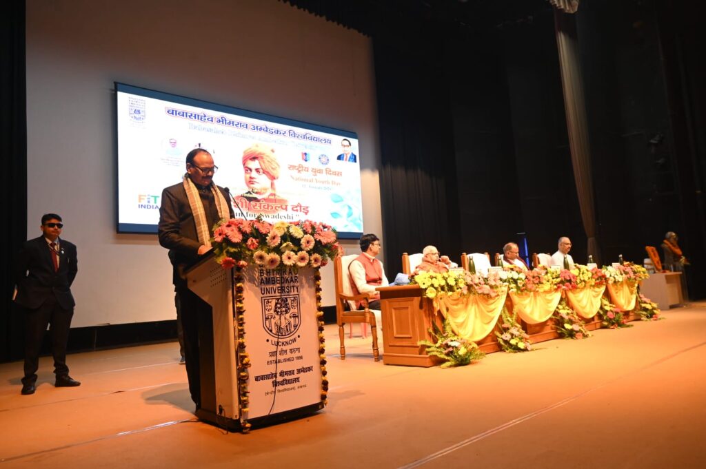 अशोक यादव : बाबासाहेब भीमराव अम्बेडकर विश्वविद्यालय में सोमवार 12 जनवरी को ‘राष्ट्रीय युवा दिवस’ एवं ‘स्वामी विवेकानंद जी की जयंती’ के अवसर पर भव्य कार्यक्रम का आयोजन किया गया। यह कार्यक्रम ‘आत्मनिर्भर भारत के निर्माण हेतु युवा शक्ति और स्वदेशी भावना : स्वामी विवेकानंद का जीवन और दर्शन’ थीम पर आयोजित किया गया। मुख्य अतिथि उत्तर प्रदेश के उपमुख्यमंत्री ब्रजेश पाठक उपस्थित रहे। कार्यक्रम की अध्यक्षता विश्वविद्यालय कुलपति प्रो. राज कुमार मित्तल द्वारा की गयी। इसके अतिरिक्त मुख्य तौर पर प्रसिद्ध सामाजिक कार्यकर्ता कश्मीरी लाल, दीनदयाल उपाध्याय विश्वविद्यालय, गोरखपुर की प्रो. विनोद सोलंकी, कंसल्टेंट, इनक्यूबेशन एंड इंटरप्रेन्योरशिप, बीबीएयू डॉ. मनोज जोशी, शिक्षा विभाग, बीबीएयू के विभागाध्यक्ष एवं संकायाध्यक्ष प्रो. राज शरण शाही, कार्यक्रम संयोजक प्रो. नवीन कुमार अरोड़ा एवं कुलसचिव डॉ. अश्विनी कुमार सिंह मौजूद रहे।