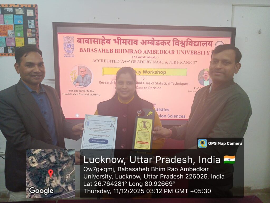 अशोक यादव, लखनऊ : बाबासाहेब भीमराव अम्बेडकर विश्वविद्यालय में गुरुवार 11 दिसंबर को सांख्यिकी विभाग की ओर से ‘अनुसंधान पद्धति और सांख्यिकी तकनीकों का उपयोग – डेटा से निर्णय तक’ विषय पर आयोजित पांच दिवसीय कार्यशाला में प्रतिचयन विधि (Sampling Technique) एवं विचरण विश्लेषण (Analysis of Variance) विषय पर विशेष व्याख्यान का आयोजन किया गया। कार्यशाला के दौरान मुख्य वक्ता के तौर पर डॉ. सुभाष कुमार यादव एवं डॉ. मीनाक्षी मिश्रा उपस्थित रहीं। इसके अतिरिक्त कार्यक्रम संयोजक डॉ. राहुल वार्ष्णेय का अहम योगदान रहा।