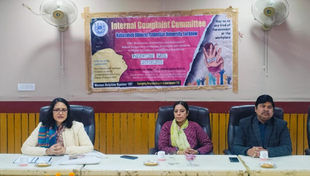 सूर्योदय भारत समाचार सेवा, लखनऊ : बाबासाहेब भीमराव अम्बेडकर विश्वविद्यालय में बुधवार 17 दिसंबर को आंतरिक शिकायत समिति की ओर से गैर शिक्षण कर्मचारियों के लिए ‘कार्यस्थल पर लैंगिक उत्पीड़न (यूजीसी विनियम, 2015)’ विषय पर जागरूकता कार्यक्रम का आयोजन किया गया। कार्यक्रम के दौरान मुख्य तौर पर सामाजिक कार्यकर्ता डॉ. शुचिता चतुर्वेदी एवं आंतरिक शिकायत समिति, बीबीएयू की अध्यक्ष प्रो. आभा मिश्रा उपस्थित रहीं।