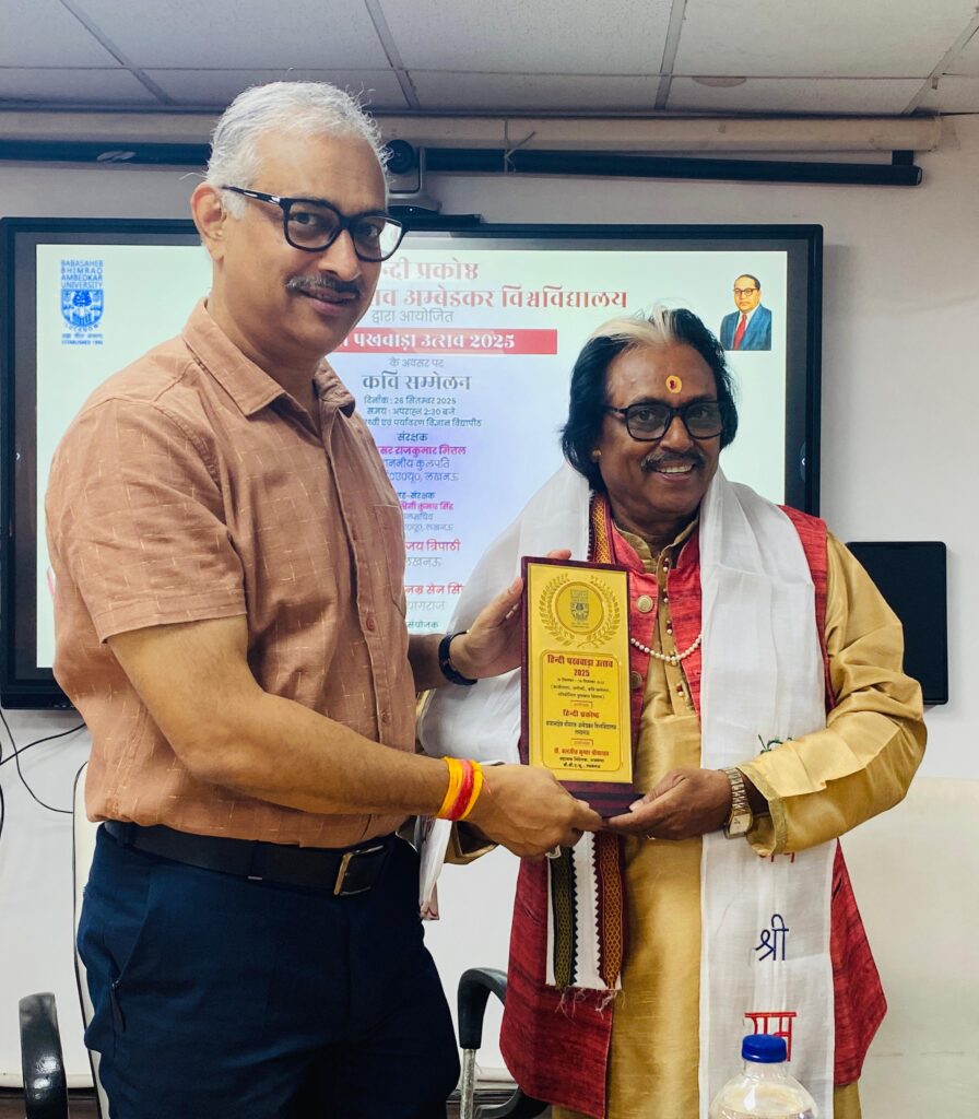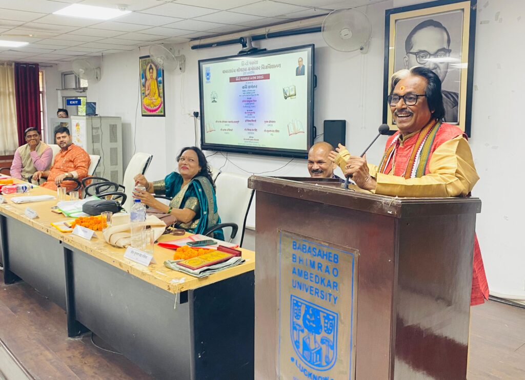 सूर्योदय भारत समाचार सेवा, लखनऊ : बाबासाहेब भीमराव अम्बेडकर विश्वविद्यालय में शुक्रवार 26 सितंबर को हिंदी प्रकोष्ठ की ओर से आयोजित ‘हिंदी पखवाड़ा उत्सव 2025’ के अंतर्गत कवि सम्मेलन का आयोजन किया गया। कार्यक्रम की अध्यक्षता कुलसचिव डॉ. अश्विनी कुमार सिंह ने की। इसके अतिरिक्त मंच पर प्रसिद्ध कवियों में लखनऊ से विजय त्रिपाठी एवं अशोक अग्निपथी, बनारस से ए.के. श्रीवास्तव ‘चकाचौंध ज्ञानपुरी एवं पूनम श्रीवास्तव, प्रयागराज के डॉ. विनम्र सेन सिंह एवं मऊ के डॉ. सुभाष चंद्र रसिया और सहायक निदेशक, राजभाषा, बीबीएयू एवं कार्यक्रम संयोजक डॉ. बलजीत कुमार श्रीवास्तव उपस्थित रहे। सर्वप्रथम कार्यक्रम संयोजक डॉ. बलजीत कुमार श्रीवास्तव ने कार्यक्रम में उपस्थित सभी लोगों का स्वागत किया एवं सभी को कार्यक्रम के उद्देश्य एवं रुपरेखा से अवगत कराया।