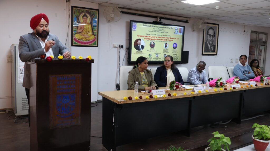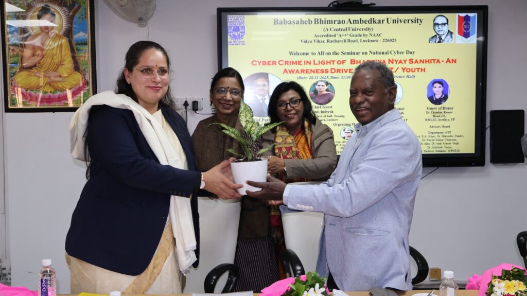 सूर्योदय भारत समाचार सेवा, लखनऊ : बाबासाहेब भीमराव अम्बेडकर विश्वविद्यालय में शुक्रवार 28 नवंबर को ‘भारतीय न्याय संहिता के संदर्भ में साइबर अपराध: जेन-ज़ी/युवा वर्ग में’ विषय पर जागरूकता कार्यक्रम का आयोजन किया गया। यह कार्यक्रम सूचना प्रौद्योगिकी विभाग, 20 यूपी गर्ल्स बटालियन, एनसीसी लखनऊ , 67 यूपी बटालियन, एनसीसी लखनऊ एवं सेंटर फॉर पोस्ट ग्रेजुएट लीगल‌ स्टडीज के संयुक्त तत्वावधान में आयोजित किया गया। कार्यक्रम की अध्यक्षता कार्यवाहक कुलपति प्रो. एस. विक्टर बाबू ने की। मुख्य अतिथि के तौर पर इंस्टीट्यूट ऑफ ज्यूडिशियल ट्रेनिंग एंड रिसर्च, लखनऊ की डिप्टी डायरेक्टर श्रीमती इंद्रेश जी‌ उपस्थित रहीं। इसके अतिरिक्त मंच पर विशिष्ट अतिथि के तौर पर राम मनोहर लोहिया राष्ट्रीय विधि विश्वविद्यालय के डॉ. अमनदीप सिंह, राम मनोहर लोहिया अवध विश्वविद्यालय, अयोध्या के कम्प्यूटर इंजीनियरिंग विभाग के विभागाध्यक्ष डॉ.चंदन कुमार, प्रो. प्रीति मिश्रा, सूचना प्रौद्योगिकी विभाग की विभागाध्यक्ष एवं कार्यक्रम संयोजक कैप्ट. (डॉ.) राजश्री उपस्थित रहीं। कार्यक्रम की शुरुआत दीप प्रज्वलन एवं बाबासाहेब के छायाचित्र पर पुष्पांजलि अर्पित करने के साथ हुई।