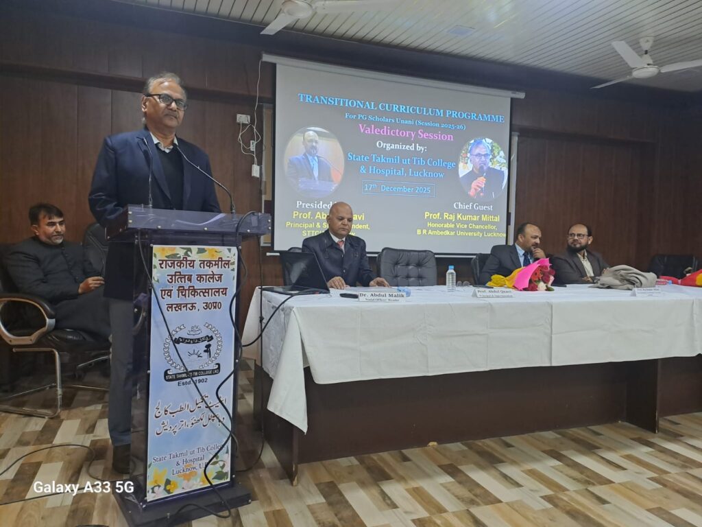 सूर्योदय भारत समाचार सेवा, लखनऊ : बाबासाहेब भीमराव अम्बेडकर विश्वविद्यालय के कुलपति प्रो. राज कुमार मित्तल ने राज्य तकमील-उत-तिब कॉलेज एवं अस्पताल, लखनऊ में बुधवार 17 दिसंबर को स्नातकोत्तर (पीजी) यूनानी विद्यार्थियों हेतु आयोजित ट्रांजिशनल करिकुलम प्रोग्राम (2025–26) के समापन समारोह में विद्यार्थियों को संबोधित किया। कार्यक्रम प्रो. राज कुमार मित्तल के मुख्य आतिथ्य में अब्दुल अज़ीज़ हॉल में संपन्न हुआ। इसके अतिरिक्त डॉ. मुईद अहमद, अध्यक्ष, नेशनल यूनानी डॉक्टर्स वेलफेयर एसोसिएशन, लखनऊ एवं डॉ. अनीस अहमद, एसोसिएट प्रोफेसर, विधि विभाग, डॉ. भीमराव अंबेडकर विश्वविद्यालय, लखनऊ ने विशिष्ट अतिथि के रूप में कार्यक्रम में सहभागिता की। कार्यक्रम की अध्यक्षता कॉलेज के प्राचार्य प्रो. अब्दुल क़वी ने की।