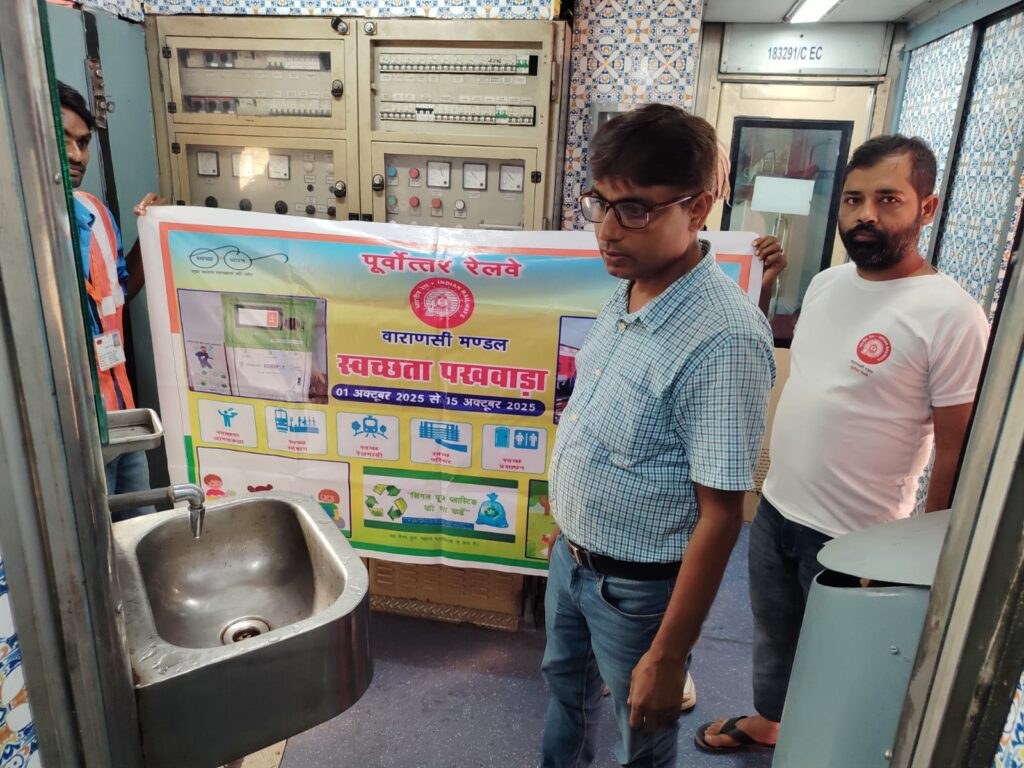 सूर्योदय भारत समाचार सेवा, वाराणसी : सम्पूर्ण भारतीय रेलवे के साथ –साथ वाराणसी मंडल पर बुधवार 01 अक्टूबर से 15 अक्टूबर, 2025 तक “स्वच्छता पखवाड़ा” एवं 02 अक्टूबर से 31 अक्टूबर, 2025 तक विशेष स्वच्छता अभियान-5.0 मंडल रेल प्रबंधक आशीष जैन के निर्देशन एवं वरिष्ठ मंडल यांत्रिक इंजीनियर अभिषेक राय के नेतृत्व में चलाया जा रहा है । इसी क्रम में वाराणसी मंडल पर पखवाड़े के अंतर्गत रविवार 05 अक्टूबर, 2025 का दिन स्वच्छ रेलगाड़ी दिवस के रूप में मनाया गया ।