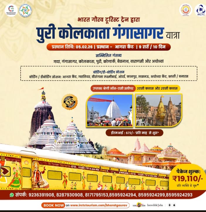 इंडियन रेलवे केटरिंग एण्ड टूरिज्म कार्पोरेशन लि0 (आईआरसीटीसी) द्वारा आगरा कैंट रेलवे स्टेशन से भारत गौरव पर्यटक ट्रेन द्वारा गया, पुरी जगन्नाथ, कोणार्क मंदिर, कोलकाता, गंगासागर, बैद्यनाथ धाम, वाराणसी, अयोध्या की यात्रा का संचालन किया जा रहा है।