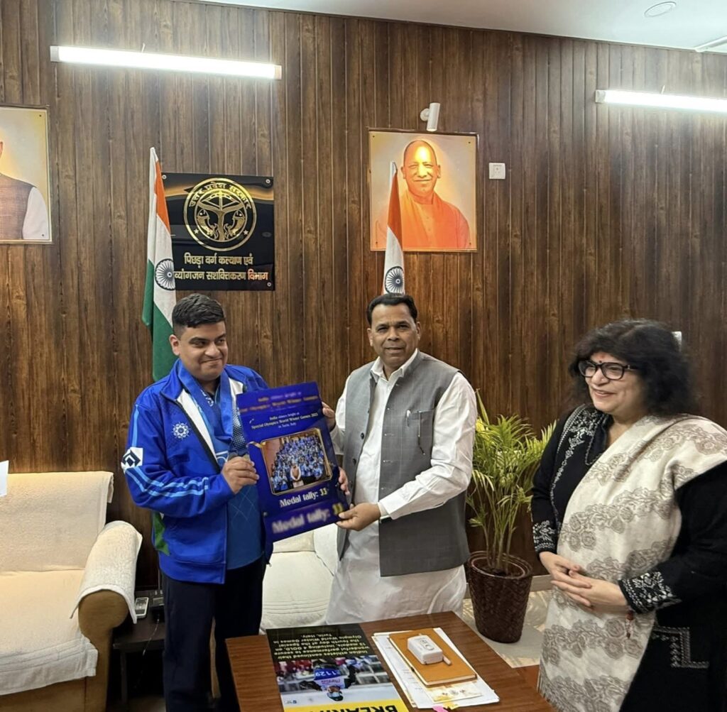 सूर्योदय भारत समाचार सेवा, लखनऊ : स्पेशल ओलंपिक में अंतरराष्ट्रीय स्तर पर देश और प्रदेश का नाम रोशन करने वाले 32 वर्षीय खिलाड़ी वासु तिवारी को रविवार को पिछड़ा वर्ग कल्याण एवं दिव्यांगजन सशक्तिकरण राज्यमंत्री ( स्वतंत्र प्रभार) नरेंद्र कश्यप ने लखनऊ स्थित आवास पर मेडल पहनाकर सम्मानित किया।