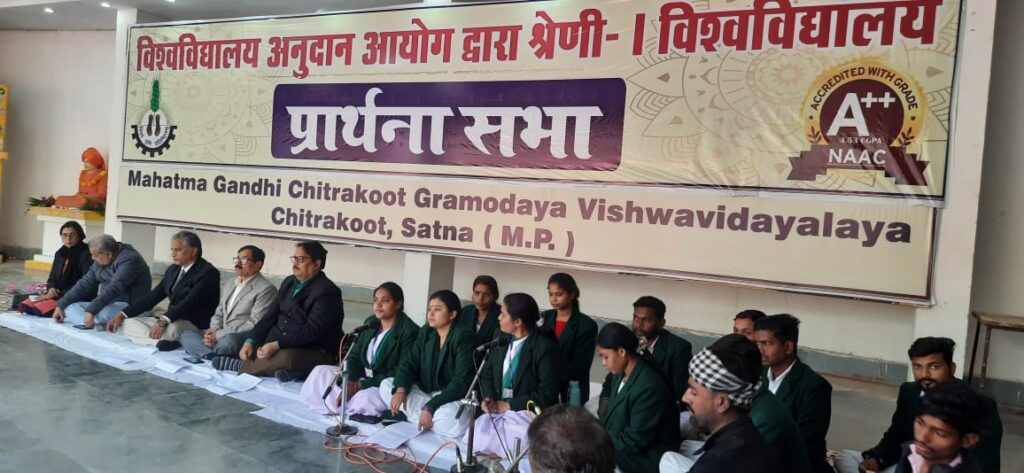 सूर्योदय भारत समाचार सेवा, चित्रकूट : मूल्य एवं सामाजिक उत्तरदायित्व पाठ्यक्रम के अभिन्न अंग के रूप में महात्मा गांधी चित्रकूट ग्रामोदय विश्वविद्यालय द्वारा अंगीकृत मासिक प्रार्थना सभा का आयोजन विवेकानंद सभागार में बीएड समूह, कला संकाय द्वारा ॐ के सामूहिक उच्चारण और सरस्वती वंदना के साथ हुआ। इस मौके पर अनिल शुक्ला ने गीता के श्लोक – भावार्थ प्रस्तुत किए। अभिषेक कुमार सोनी द्वारा महापुरुष की जीवनी के रूप में सरदार वल्लभभाई पटेल के व्यक्तित्व और कृतित्व पर प्रकाश डाला गया। सोनालिका सेन ने एकल गायन के रूप में बघेलखंडी लोक गीत प्रस्तुत हुए। राज कुमार सिंह ने गणित के जादूगर निवास रामनुजन के वैशिष्ट्य पर प्रकाश डाला।