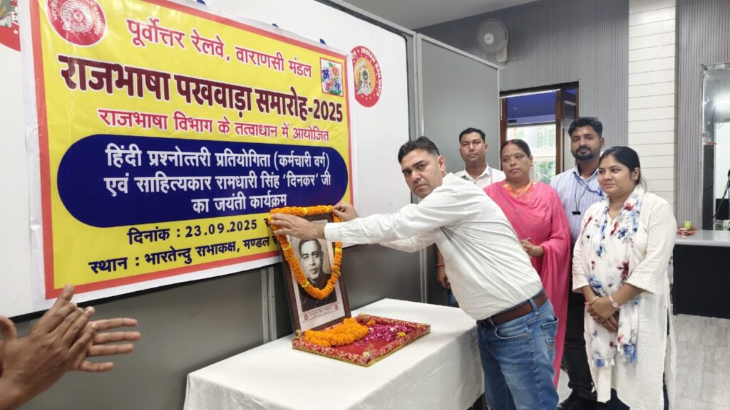 सूर्योदय भारत समाचार सेवा, वाराणसी : मंगलवार 23.09.2025 को पूर्वोत्तर रेलवे, वाराणसी मंडल के मंडल रेल प्रबंधक आशीष जैन के निर्देशन में चल रहे राजभाषा पखवाड़ा समारोह 2025 के दौरान राजभाषा विभाग के तत्वावधान में भारतेंदु सभाकक्ष में हिंदी प्रश्नोत्तरी प्रतियोगिता (कर्मचारी वर्ग) एवं साहित्यकार रामधारी सिंह ‘दिनकर’ जी की जयंती का आयोजन किया गया। हिंदी प्रश्नोत्तरी प्रतियोगिता में कुल 30 प्रतिभागियों ने भाग लिया।