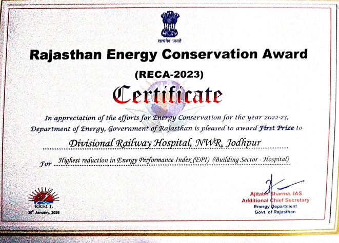 ऊर्जा संरक्षण हेतु भवन (अस्पताल) श्रेणी में राजस्थान के मंडलीय रेलवे अस्पताल, जोधपुर को प्रथम पुरस्कार से सम्मानित किया गया है।