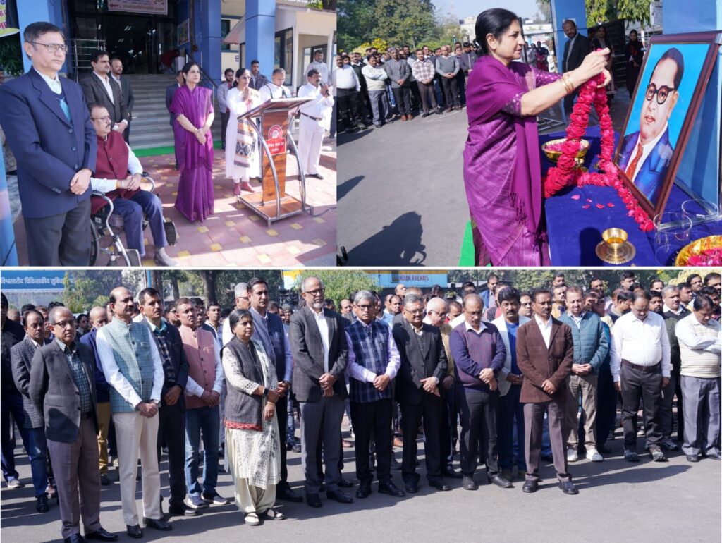 सूर्योदय भारत समाचार सेवा, जबलपुर : पश्चिम मध्य रेल में सोमवार 08 दिसम्बर 2025 को भारत रत्न डॉक्टर भीमराव अंबेडकर जी के महापरिनिर्वाण दिवस के उपलक्ष्य में श्रृद्धांजलि दी गई। इस अवसर पर पमरे मुख्यालय प्रांगण में आयोजित मुख्य समारोह में महाप्रबंधक श्रीमती शोभना बंदोपाध्याय द्वारा दीप प्रज्ज्वलित कर भारत रत्न डॉ. भीमराव अंबेडकर जी के चित्र पर माल्यार्पण करके पुष्पांजलि अर्पित करते हुए श्रृद्धांजलि दी गई। साथ ही सुजाता इंगले, किशोर कुमार गजभिए एवं अमर प्रभुजी वाघमारे द्वारा बौद्ध वंदना भी प्रस्तुत की गई।