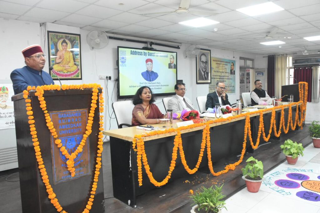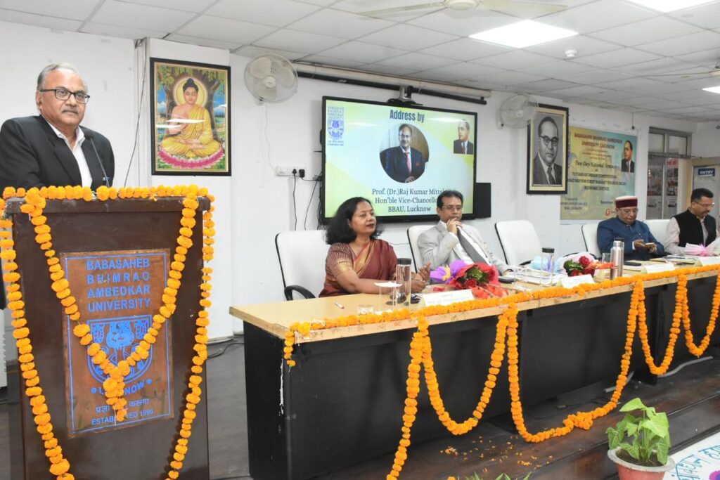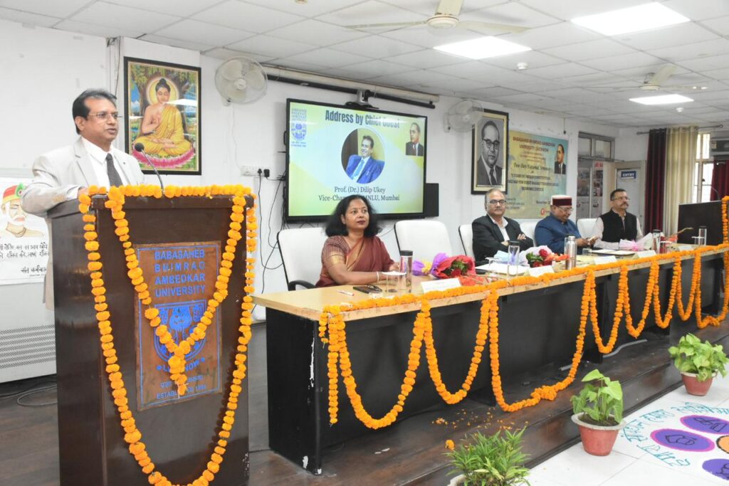 अशोक यादव, लखनऊ : बाबासाहेब भीमराव अम्बेडकर विश्वविद्यालय में मंगलवार 25 नवंबर को विधि विभाग की ओर से ‘भारतीय संविधान के 75 वर्ष: सामाजिक-आर्थिक न्याय के माध्यम से विकसित भारत का मार्ग-मानचित्र’ विषय पर आयोजित द्विदिवसीय राष्ट्रीय संगोष्ठी का उद्घाटन हुआ। कार्यक्रम की अध्यक्षता विश्वविद्यालय के कुलपति प्रो. राज कुमार मित्तल ने की। मुख्य अतिथि के तौर पर महाराष्ट्र नेशनल लॉ यूनिवर्सिटी, मुम्बई के कुलपति प्रो. दिलीप उके उपस्थित रहे। मंच पर विशिष्ट अतिथि एवं असम राज्यपाल भवन, गुवाहाटी में राज्यपाल सचिवालय के सलाहकार प्रो. हरबंश दीक्षित, विधि अध्ययन विद्यापीठ के संकायाध्यक्ष प्रो. संजीव कुमार चढ्ढा एवं विधि विभाग की विभागाध्यक्ष एवं कार्यक्रम संयोजक प्रो. सुदर्शन वर्मा उपस्थित रहीं।