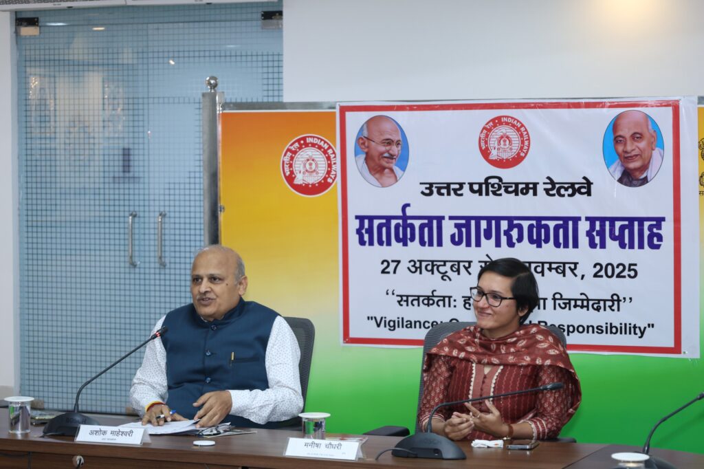 सूर्योदय भारत समाचार सेवा, जयपुर : उत्तर पश्चिम रेलवे पर 27 अक्टूबर से 2 नवंबर 2025 तक मनाया जा रहे सतर्कता जागरूकता सप्ताह के अंतर्गत बुधवार 29.10.2025 को मुख्यालय के सभागार में “सतर्कता: हमारी साझा जिम्मेदारी” विषय पर संगोष्ठी का आयोजन किया गया, जिसमें सुश्री मनीषा चौधरी, आईपीएस, डीआईजी एंड हेड ऑफ ब्रांच, सीबीआई-एसीबी, जयपुर अतिथि वक्ता के रूप में उपस्थित रहीं।